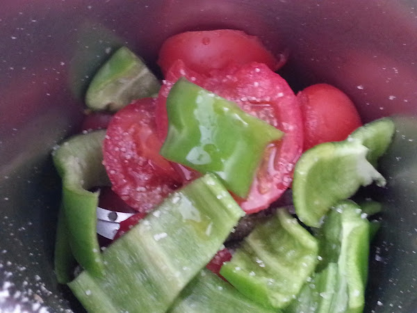 2. - Ponemos en un lebrillo o recipiente de barro, los ajos, el pimiento, los tomates, la sal y el aceite, y majamos hasta que esté todo triturado. En la batidora o termo, triturar un minuto o menos, vigilando que no haga una crema.