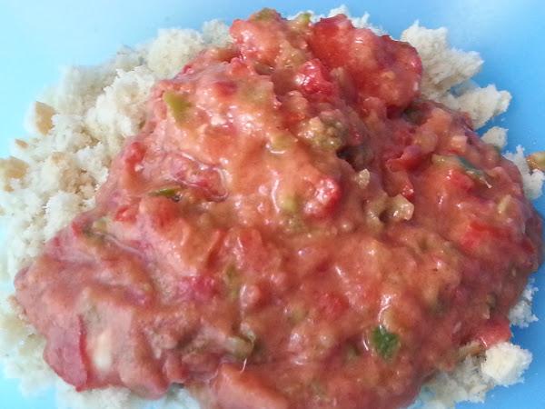 3. - Esta mezcla la echamos sobre el pan reservado y mezclamos bien, para que empape el pan todo el jugo del tomate.