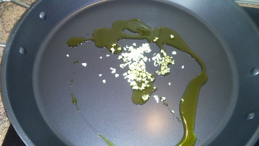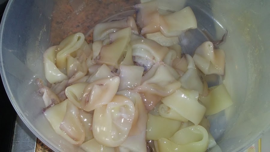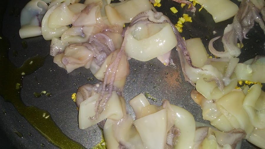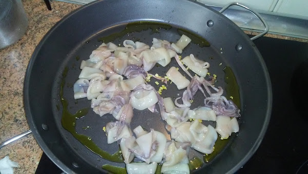 En una paellera añadir un ajo picado con aove y dejar que tome un poco de color. Añadir el calamar troceado, como eran pequeños no les he cortado las aletas aparte.