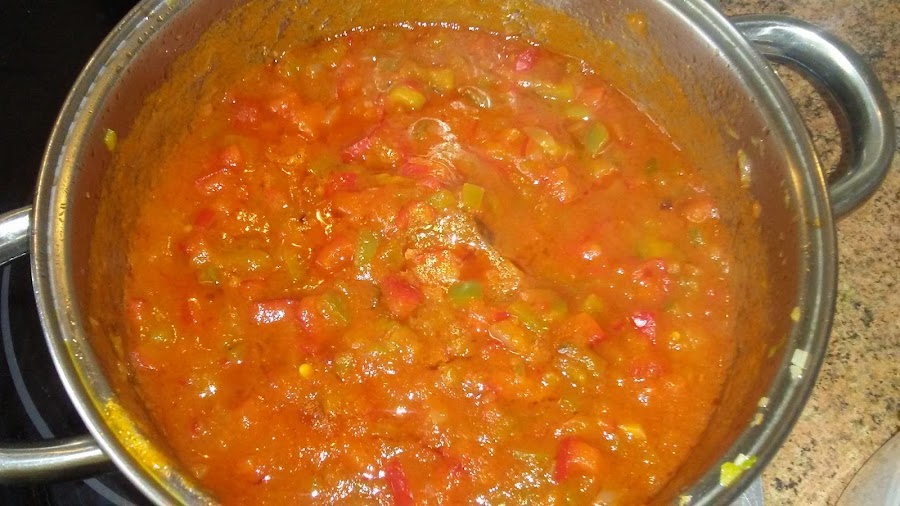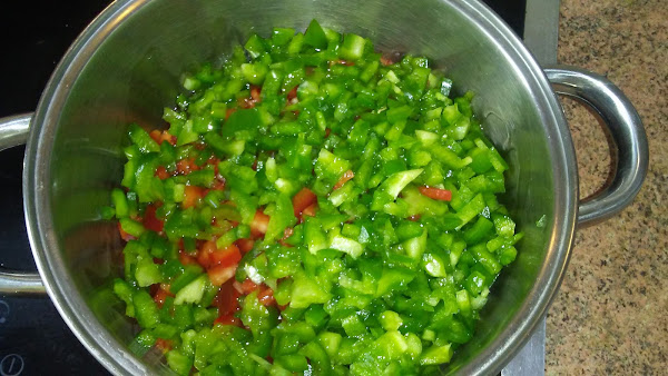 Proceder a elaborar un sofrito con los pimientos verde y rojo y la cebolla. Cuando esten pochados, añadir tomate frito en éste caso tomate frito casero que tenía del día anterior. Con ésta cantidad he hecho dos partes iguales para dos arroces. La otra parte se puede congelar para posteriormente elaborar otro arroz o arroces.