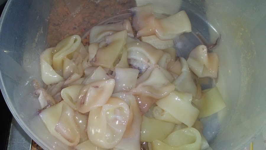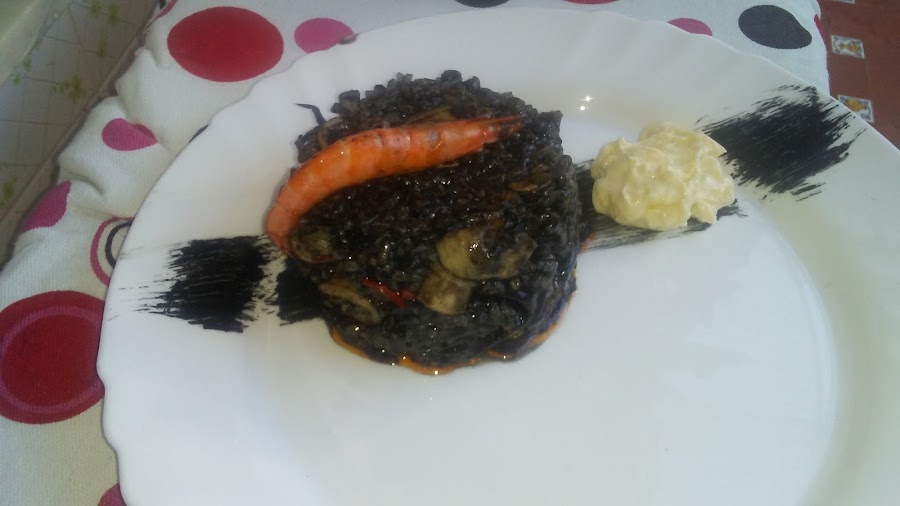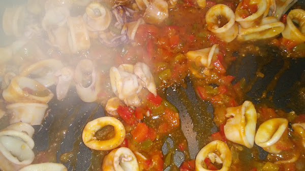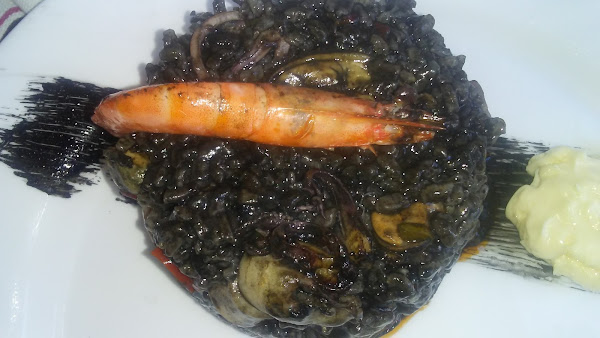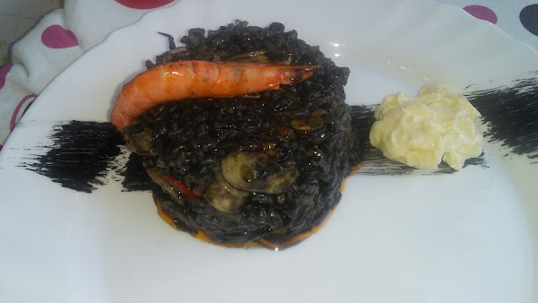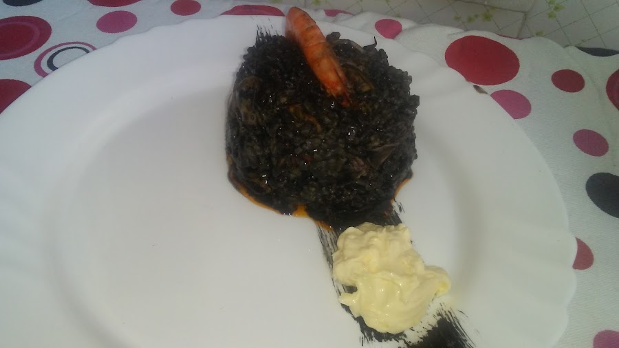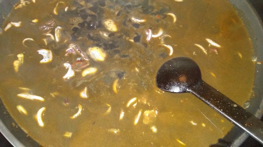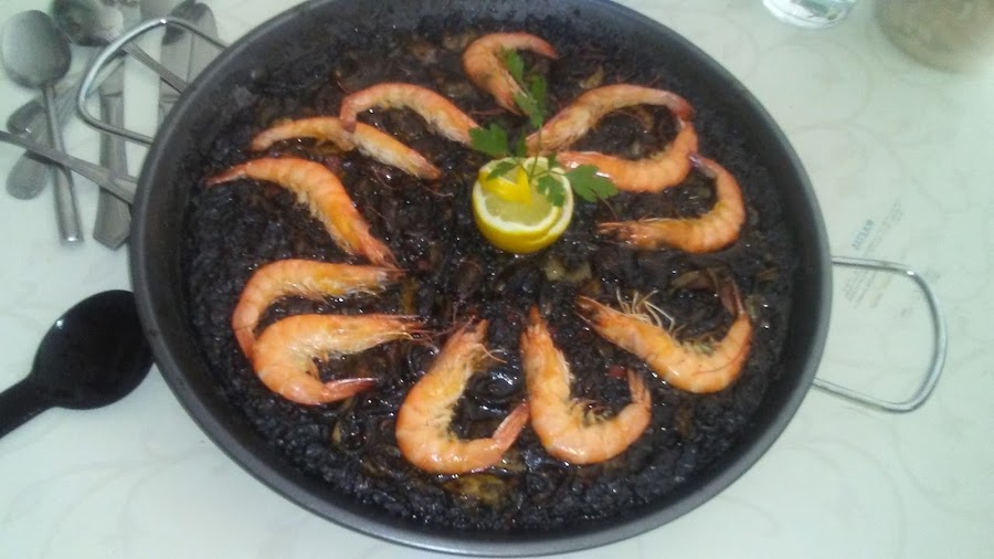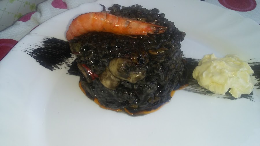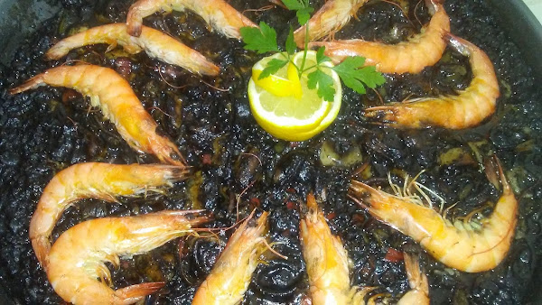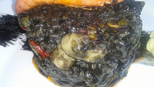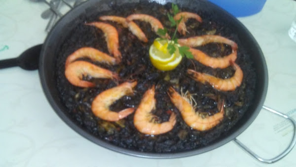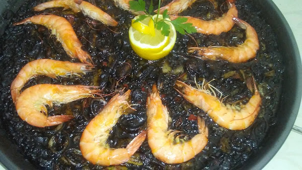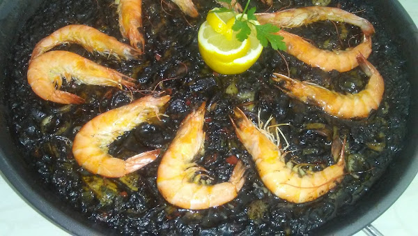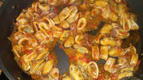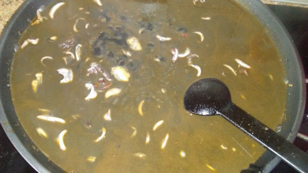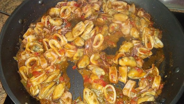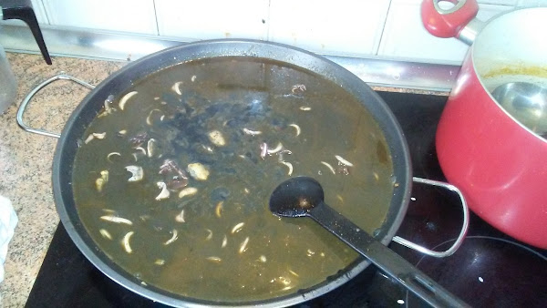 Añadir la tinta de calamar y revolver hasta que todo empieze a hervir. Añadir los mejillones y todo el marisco que queramos añadirle.