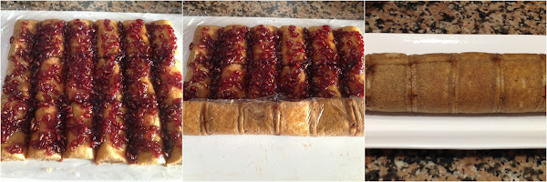 Sacamos la base de bizcochos de la nevera, quitamos el papel film de la parte superior y cubrimos con la mermelada. Comenzamos a enrollar de un entremo hacia otro con la ayuda del papel film de la base.