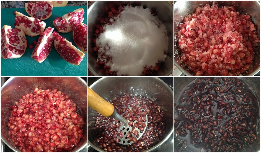 Troceamos y desgranamos las granadas y las ponemos en un cazo junto con el azúcar y el limón. Removemos bien y dejamos descansar 15 minutos. Cocinamos a fuego bajo durante 20 minutos y pasamos aplasatamos con un pasapuré para deshacer las semillas. (En este punto podemos colar para eliminar las semillas o dejarlas. Como ven, yo elegí dejarlas porque una vez cocidas, no quedan duras y me gusta el crujinete que aportan). dejamos cocinar 5 minuts más para que espese, Retiramos del fuego y dejamos enfriar. Tenemos que tener en cuenta que al enfriarse espesará un poco más.