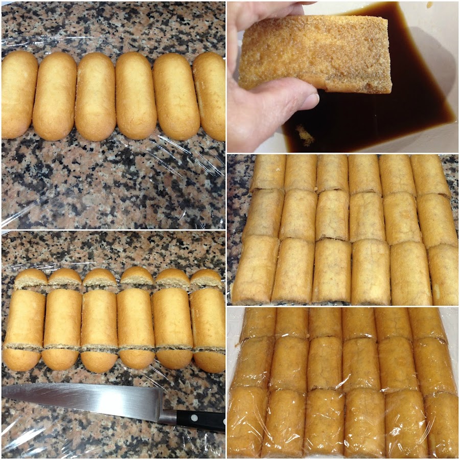 Ponemos las soletillas sobre papel film y cortamos los extremos para que queden con forma rectangular. Mojamos cada una con café, por ambos lados, pero cuidando que no absorvan mucho café. No tienen que desarmarse, sólo humedecerse. Las colocamos una al lado de la otra formando un rectángulo, como en la imágen y cubrimos con otro papel film. Ponemos sobre una bandeja o un plástico rígido y llevamos a la nevera durante 2 horas.