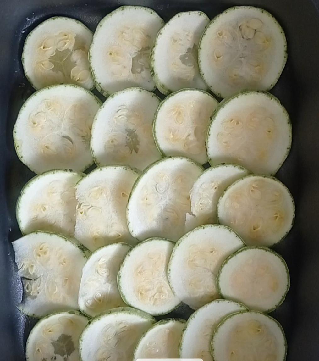 Preparar el arrollado cortando los zucchini en rodajas bien finas.Forrar la asadera con papel manteca y enmantecar, colocar encima todas las rodajas .