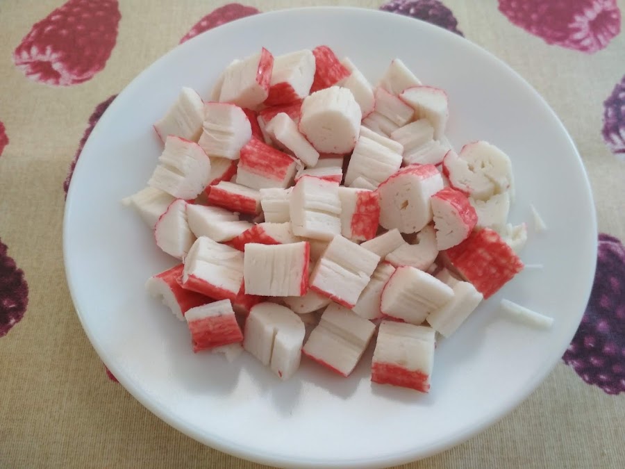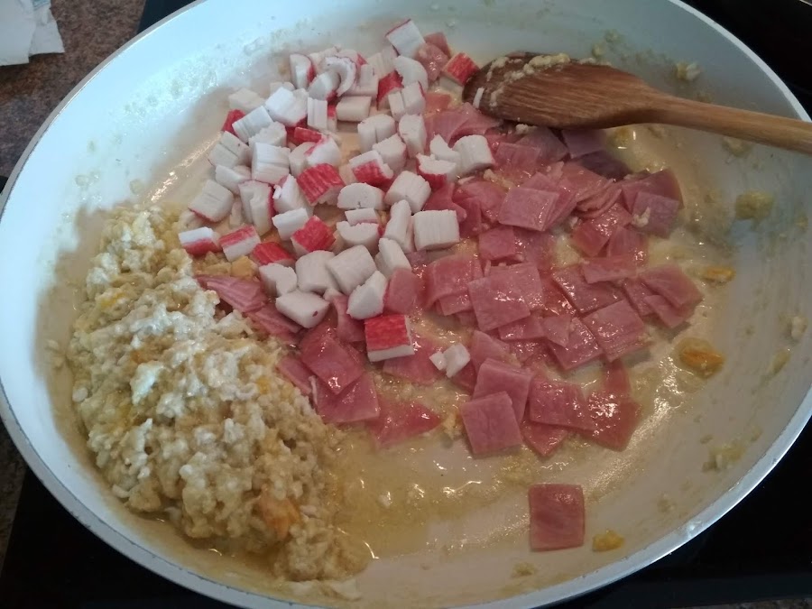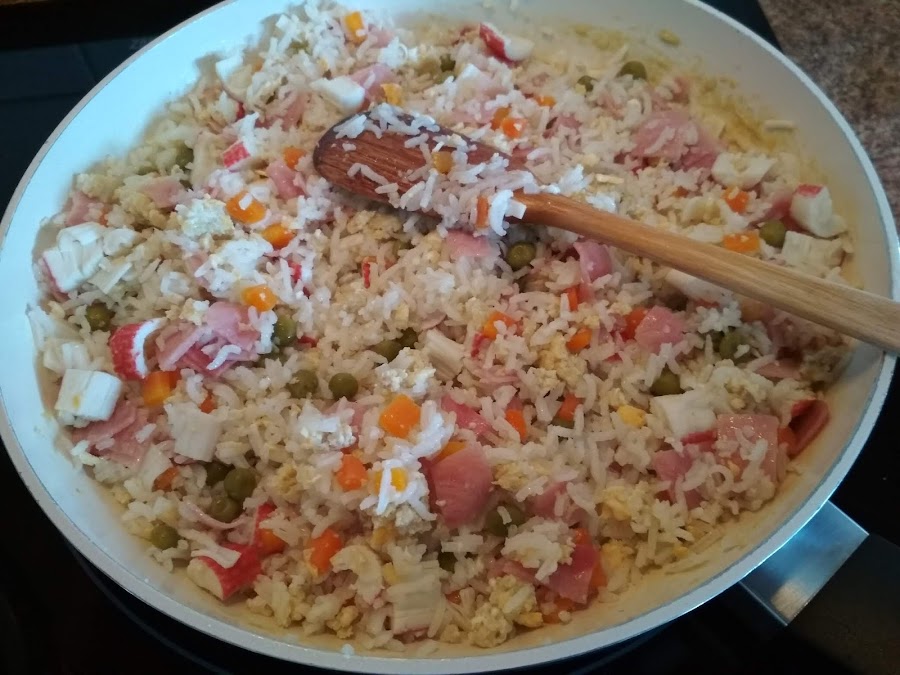 A veces le pongo gambitas de las arroceras pero si no tengo unos palitos de surimi también le van muy bien.