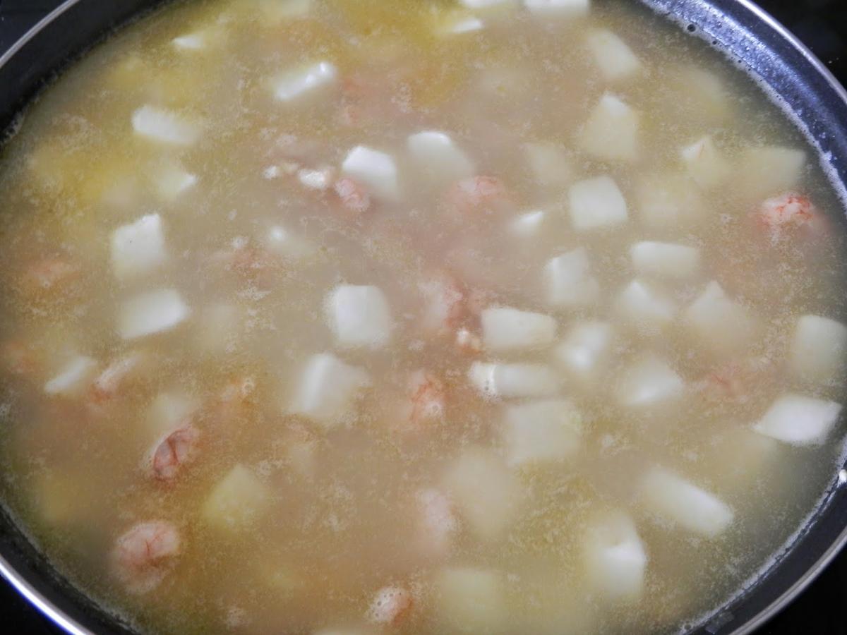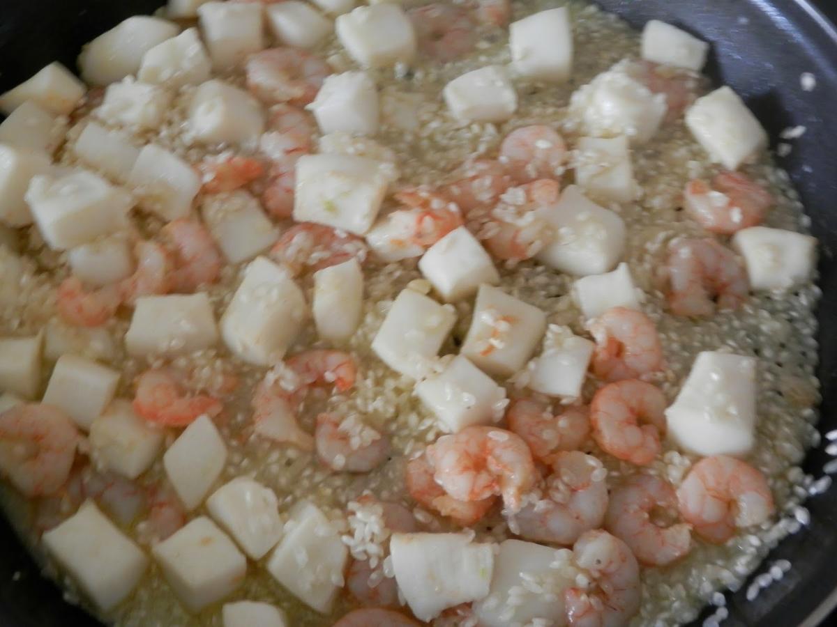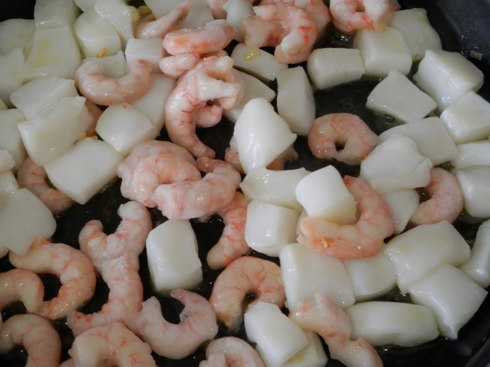 Cuando ya esté dorado, añadimos las gambas y los filetes de pota previamente cortados en dados.