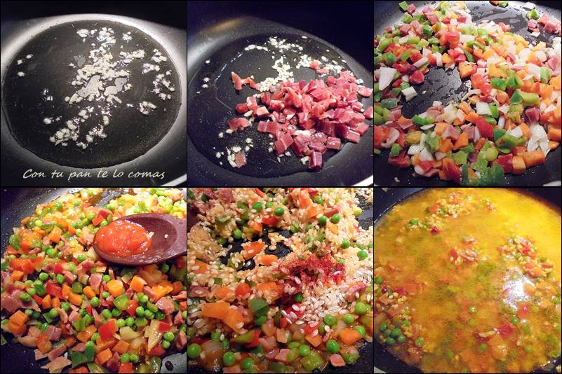 6. Medimos el arroz (1 tacita por persona) y lo añadimos y rehogamos unas vueltas con el sofrito.