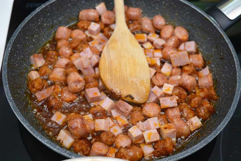 Paso 1 Como en cualquier arroz, empezaremos a cocinar este arroz a la charcutera haciendo el sofrito. Ponemos una sartén con aceite de oliva y ponemos el chorizo y la longaniza cortados en trocitos para freírlos un poco. Cuando estén a medio hacer ponemos el jamón york. Paso 2 Con la carne hecha, ponemos todo en la paellera o cazuela en la que haremos el arroz. Le añadimos 8 cucharadas soperas de fritada con tomate de IBSA, que le va a dar al arroz un gran sabor. Ponemos el pimiento asado de IBSA, un poco de caldo y dejamos que se cocine todo junto durante 5 minutos.
