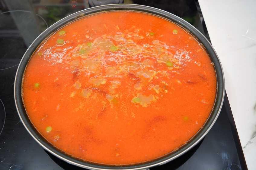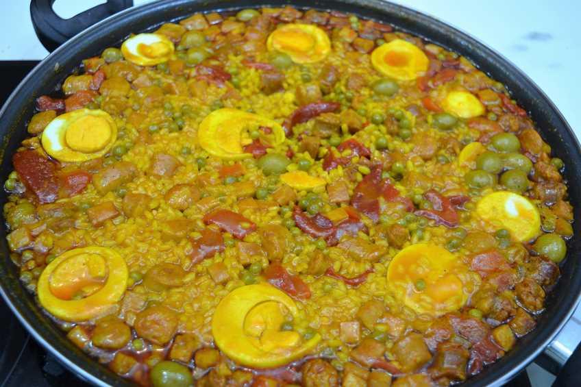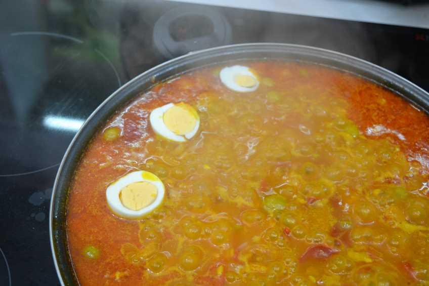 Paso 3 Pasados los 5 minutos, añadimos el arroz, removemos un poco y le ponemos el colorante alimenticio. Luego ponemos el caldo de verduras, recordando que hay que ponerle el doble que de arroz en volumen, es decir, si habéis puesto un vaso de arroz, tenéis que utilizar esa misma medida y poner el doble. Luego agregamos los guisantes y las aceitunas rellenas y esperamos a que hierva. Paso 4 En el momento que empiece a hervir, bajamos un poco el fuego para que no se quede seco y crudo el arroz. Normalmente tardará unos 20 minutos en quedar al punto. Unos 5 minutos antes de quitarlo comprobáis el punto de sal y le ponéis el huevo cocido en rodajas.