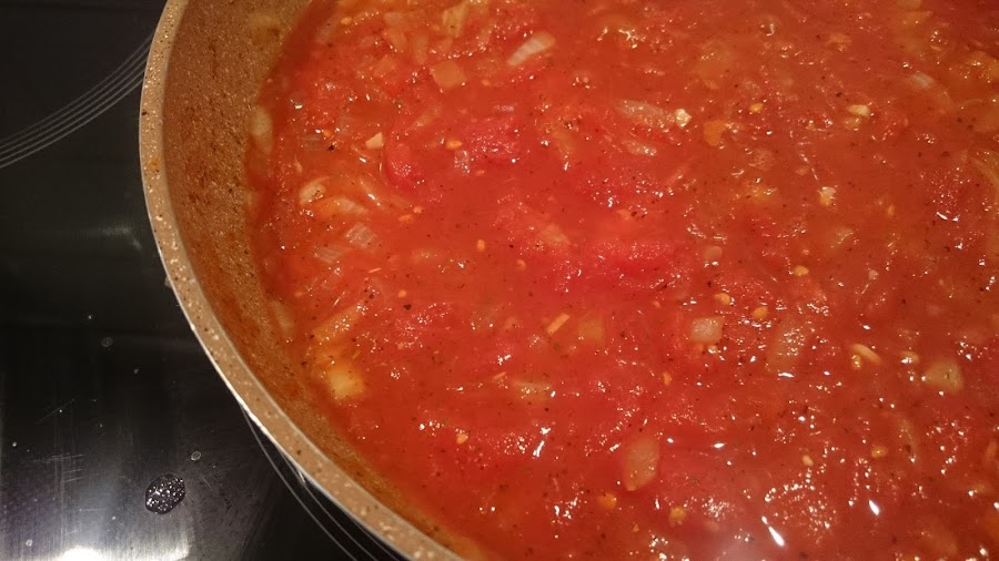 Momento de añadir el tomate entero con su jugo. NOTA: Añadimos un poco de azúcar si vemos que es necesario corregir la acidez. Espolvoreamos albahaca y orégano, salpimentamos y dejamos cocinar todo el conjunto unos 25-30 minutos a fuego suave.