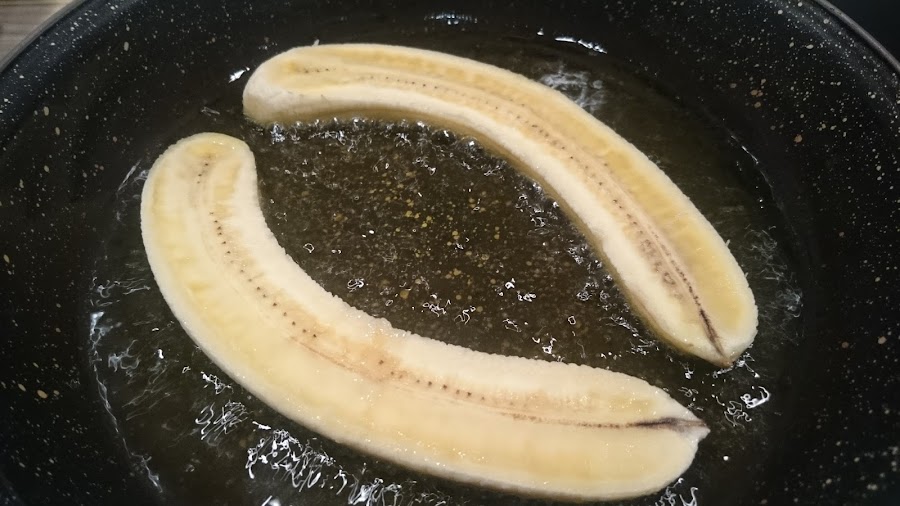 Pelamos el plátano y lo cortamos por la mitad. Los enharinamos ligeramente. Calentamos una sartén con aceite y los freímos bien hasta que se doren. Sacamos a papel absorbente.