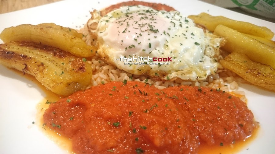 Emplatamos el arroz con la salsa de tomate a un lado, los plátanos fritos a otro y coronando la cima el huevo frito. Por supuesto que cada cual lo "expone" como más le apetezca. Yo te dejo dos formas distintas para despertar tu curiosidad. ¡Que aproveche, hitchcookian@s!