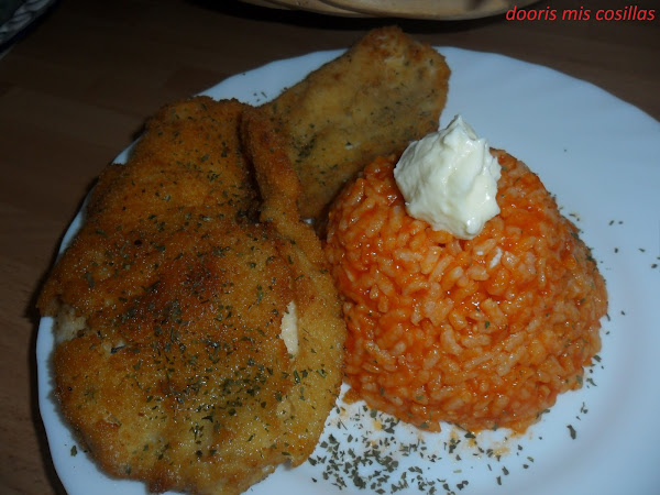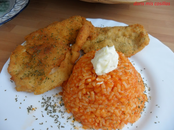 Ya solo nos queda, emplatar con el arroz en forma de cono sirviéndonos de una taza, ponemos una cucharadita de alioli en la superficie y servimos con los filetes de pollo a la milanesa. Servir de inmediato.