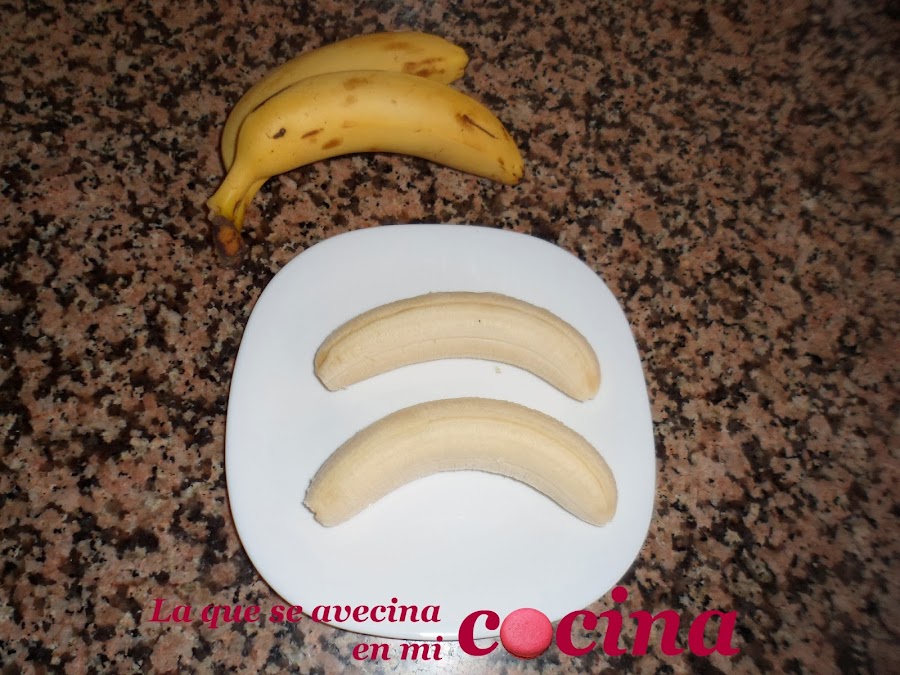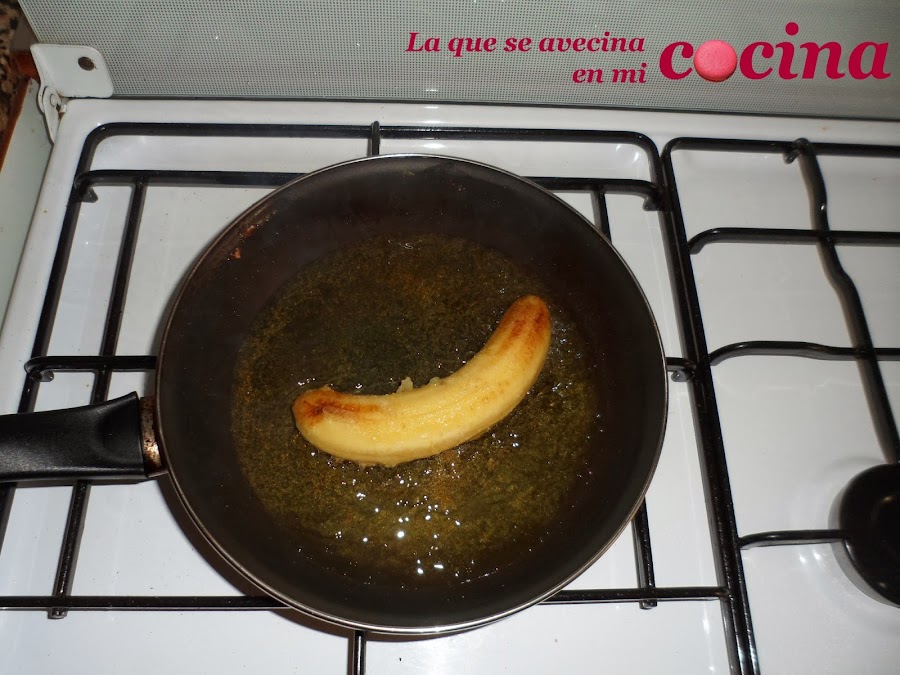 Mientras tanto pelaremos los plátanos, le quitaremos las hebras, lo pasaremos un poco por harina y los freímos. Para ello me gusta más hacerlo pasados por harina porque si lo freímos directamente sin nada, absorbe mucho aceite.