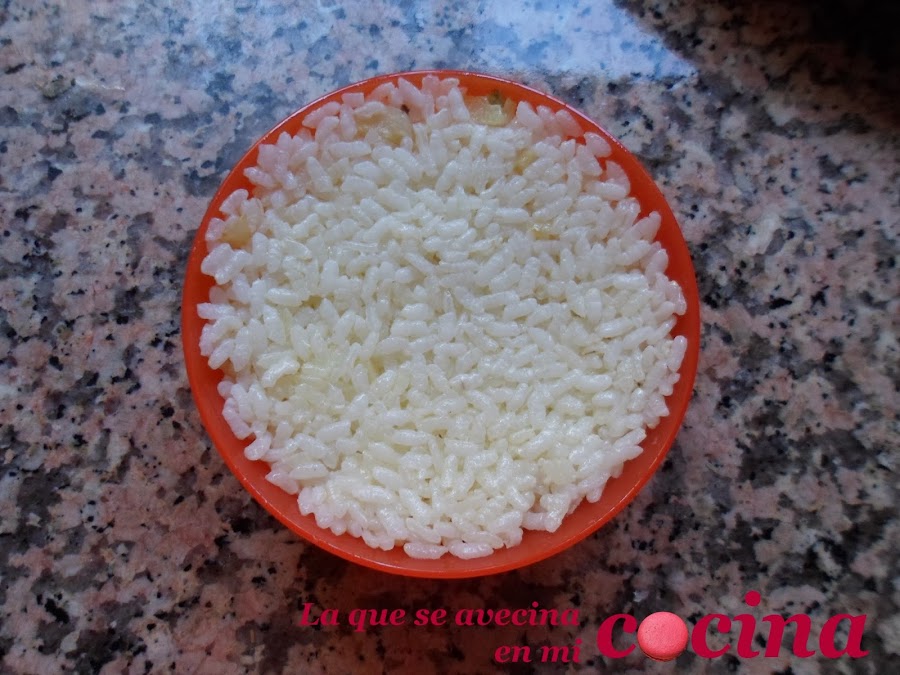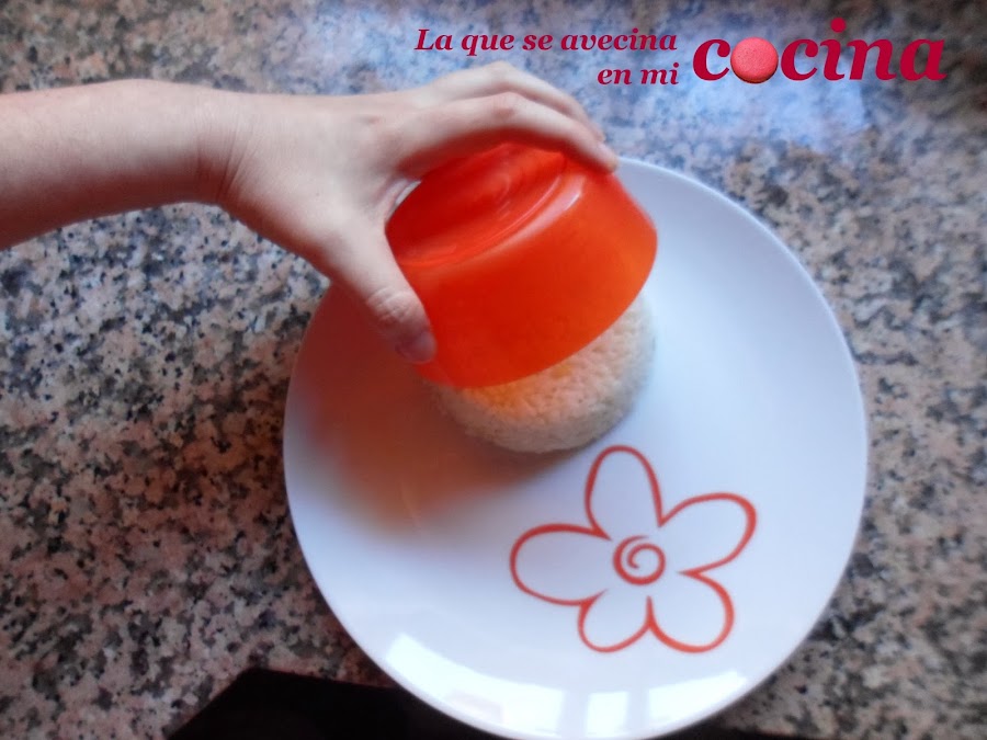 Es tan fácil como usar una taza, un vaso o lo que queramos y le echemos el arroz prensándolo con una cuchara. Yo por ejemplo he utilizado unos cuencos de plástico que tengo y que se desmoldan muy bien.