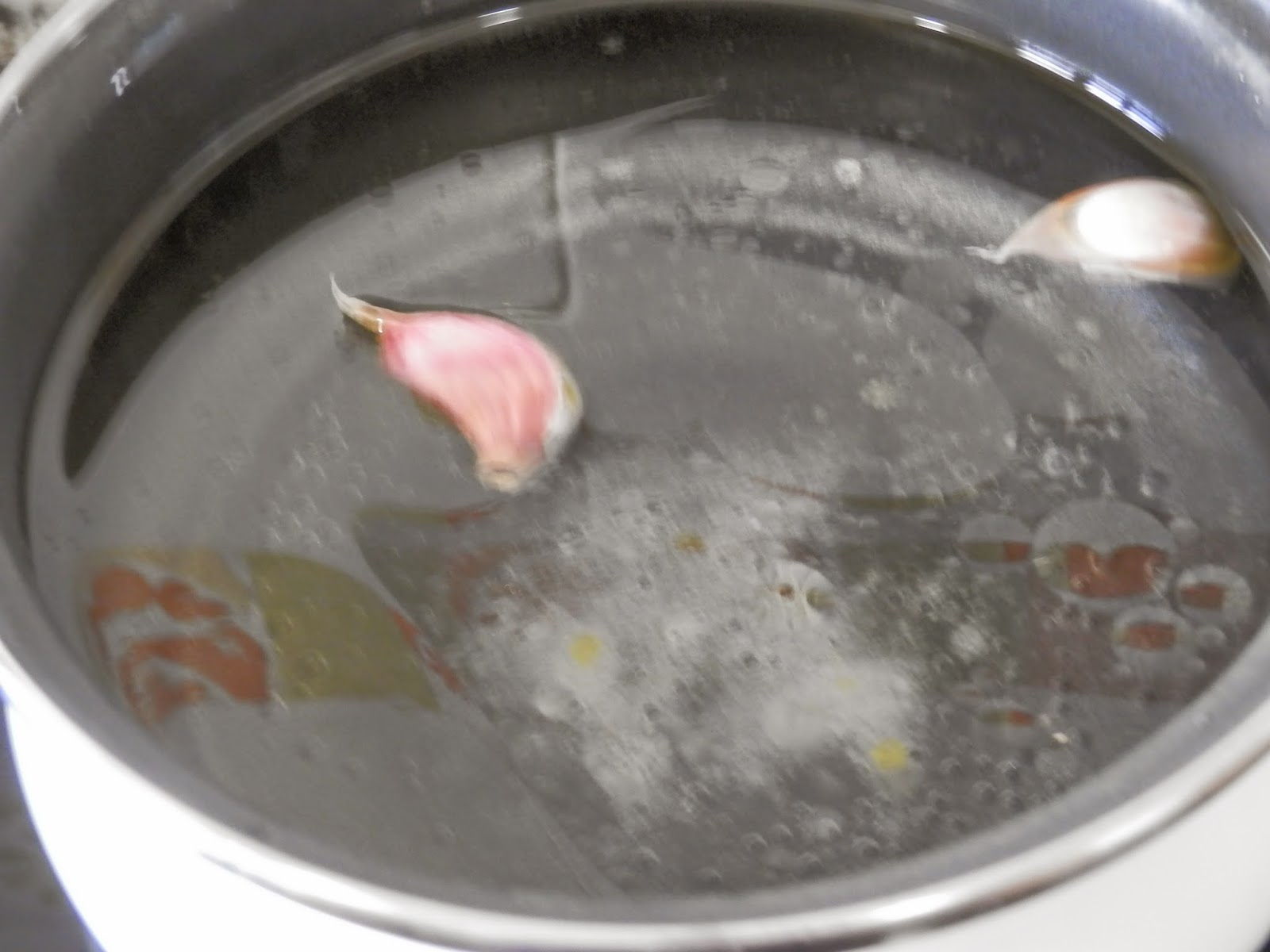 Ponemos agua a cocer con la sal, el laurel y los ajos.