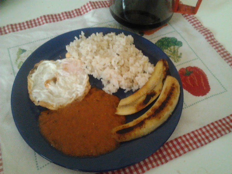 Para servir, en un plato ponemos dos cucharadas de arroz, un huevo, 1/2 plátano y un poco de salsa de tomate.