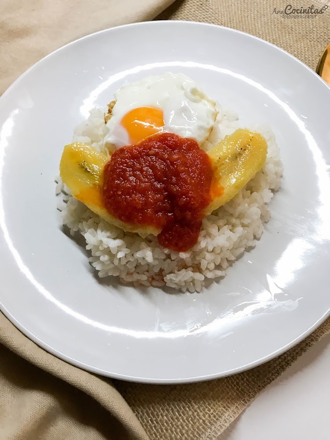 5. Solo nos queda servir. Ponemos en un plato el arroz, el huevo frito, los 2 trozos de plátano y la salsa de tomate al gusto.