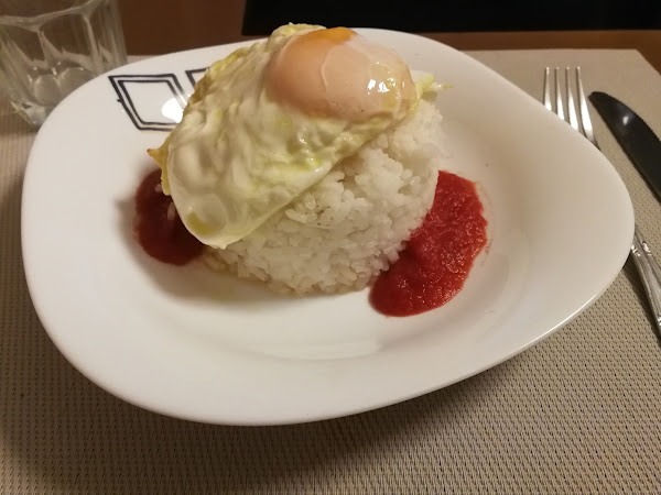Finalmente ya solo nos faltará presentar el plato, para hacerlo, pondremos la mitad del arroz haciendo una montañita en un plato (o si lo preferís, le daréis forma con un molde), sobre el arroz pondremos parte del tomate y encima de todo le pondremos el huevo, tal que así: