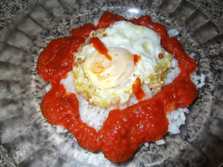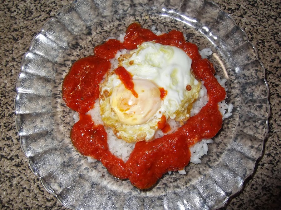 Una vez que tenéis cocinado el arroz, freís el huevo como podéis ver en la foto yo lo he hecho con puntillita que me gusta más. Ahora sólo falta montar el plato, en el fondo colocáis el arroz blanco, le echáis el tomate frito por encima y colocáis el huevo frito coronando todo. Lo lleváis a la mesa y lo revolvéis, un plato muy sencillo que a lo más pequeños de la casa les encanta.