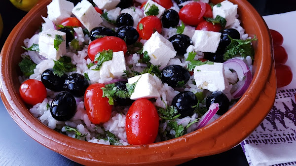 Consejo: también puedes cortar los tomates y las aceitunas y servir el arroz enseguida. Lo puedes comer templado o frío.