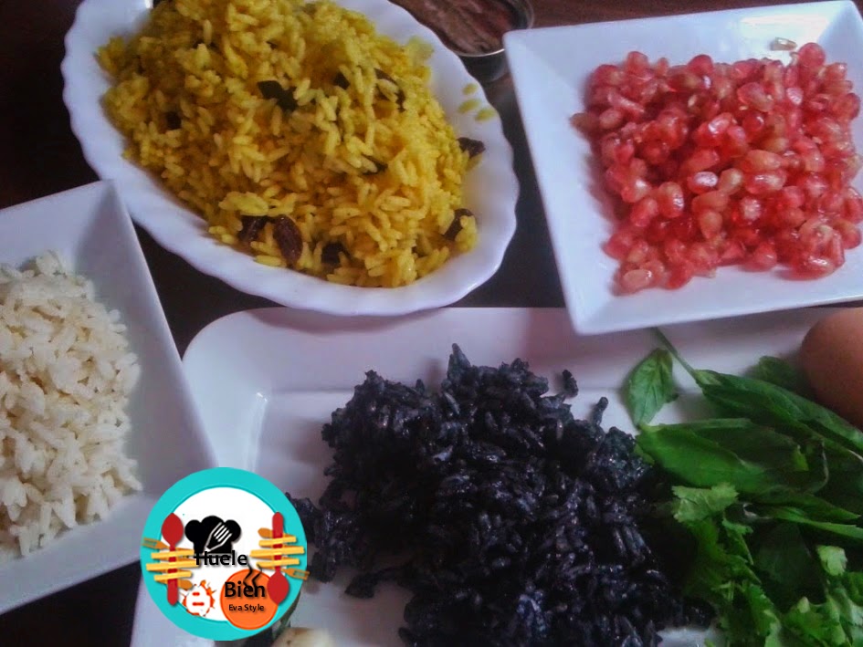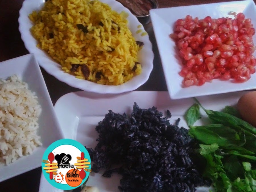 Arroz a las tres esencias; con curry y pasas, a las finas hierbas y con arroz negro. Acompañado con granada y una vinagreta de albahaca, anchoas y ajo negro.
