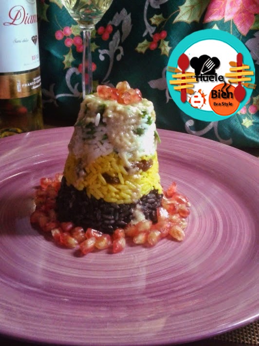 2.- Mezclamos el arroz con curry con las pasas. El arroz blanco lo mezclamos con las hierbas aromáticas. En una taza grande y alta ponemos primero el arroz blanco, después el arroz con curry y por último el arroz negro. Presionamos con una cuchara el fondo, desmoldamos sobre cada plato.