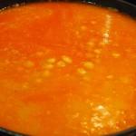 En esa misma sartén ponemos a freír el tomate y cuando esté listo añadimos los garbanzos cocidos y el arroz. Le damos unas vueltas a todo y añadimos también el caldo caliente. Probamos de sal y rectificamos si es necesario.