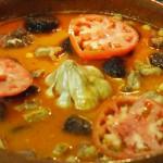 Ponemos al fuego una sartén con 3 cucharadas de aceite y freímos en el primero el magro y la panceta troceados y luego la butifarra y la morcilla. Cuando estén doradas se sacan y se reservan.