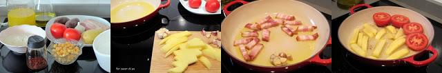 En una cazuela al fuego poner a calentar tres o cuatro cucharadas de aceite. Una vez caliente freír el bacon hasta que esté tostado, sacarlo y reservar. Tostar un poco los ajos y cuando empiecen a tomar color retirarlos y reservar.