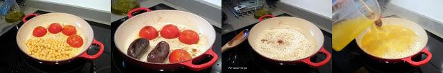 Una vez rompa a hervir repartir los garbanzos, las patatas y el bacon por toda la superficie del arroz. Colocar la cabeza de ajos en el centro, y repartir los tomates y las morcillas por alrededor.