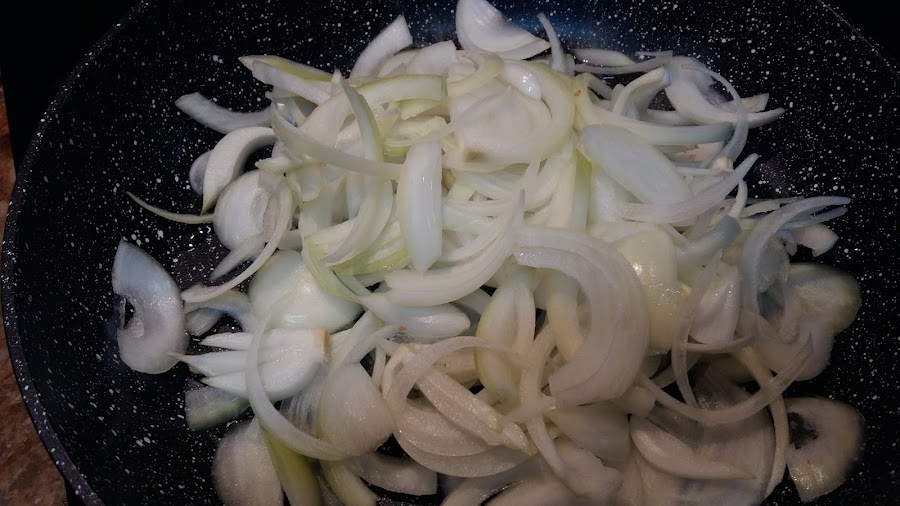 Ponemos a estofar la cebolla cortada a plumas en una sarten honda tapada, durante 20 minutos a fuego lento.