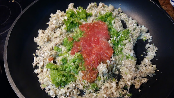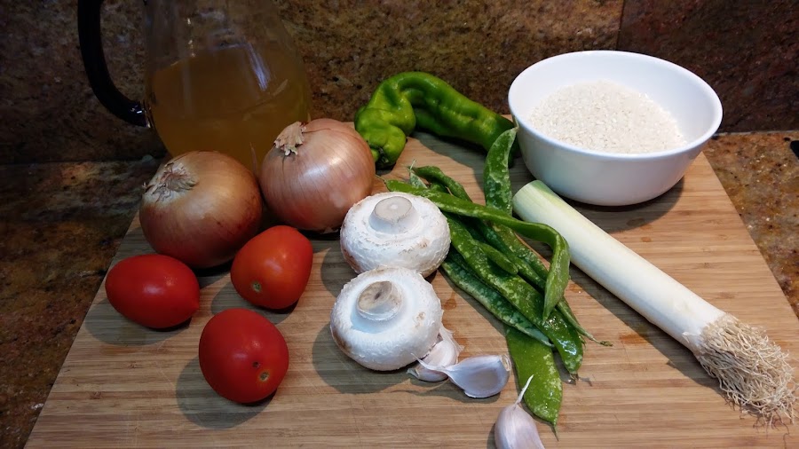 250 gr de arroz, 3 tomates rallados, 2 o 3 vasos de caldo de verduras, 3 cucharadas de puerro rallado, 3 dientes de ajo picados, 3 cucharadas de pimiento verde cortado a trocitos, 3 de judías verdes en trocitos pequeños, 3 de champiñones cortados en trocitos , 2 cebollas medianas cortadas a plumas y 1 cucharada de aceite de oliva.