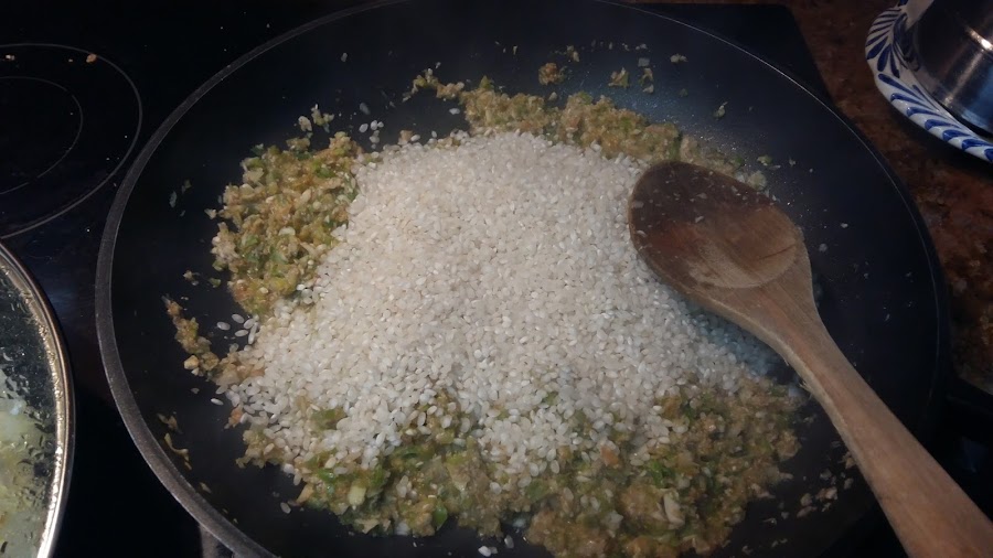 Añadimos el arroz y lo tostamos varios minutos junto a las verduras.