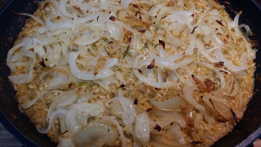 Lo metemos al horno a 200º durante 5 minutos más y la cebolla se tostará y se hará una sabrosa costra por encima.