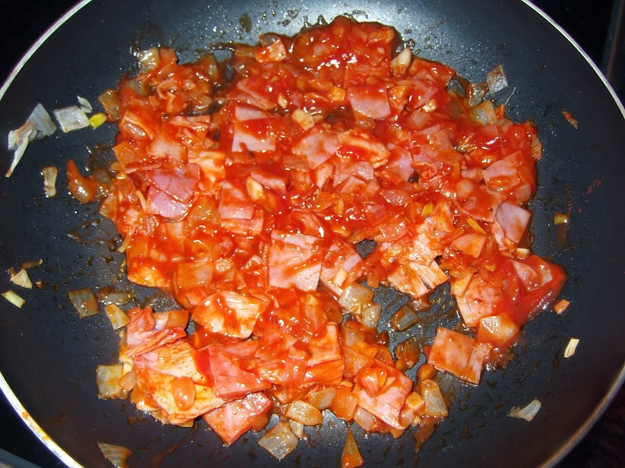 Cuando el jamón está dorado, retiramos la sartén del fuego y le añadimos la cucharadita de pimentón y le damos varias vueltas. Como os he comentado en otras ocasiones hay que retirar la sartén del fuego para que no se queme. Luego añadimos las cucharadas de tomate frito y dejamos que se haga durante un par de minutos.