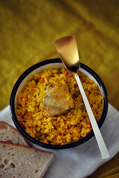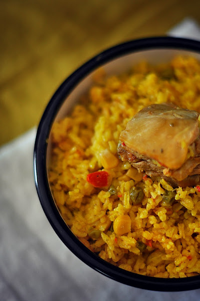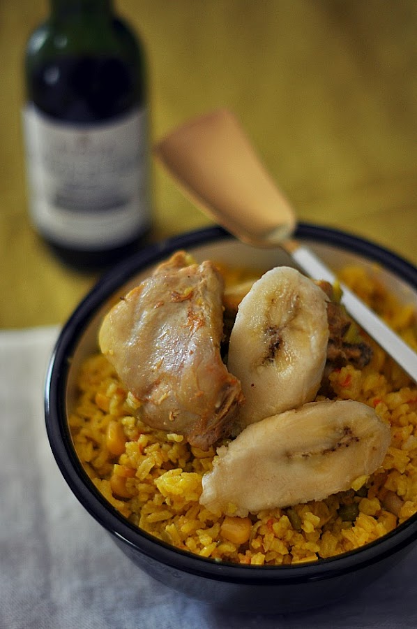 La receta que os traigo este mes es un plato cubano posiblemente con un antepasado de origen español, la paella. Siempre he creído que este arroz amarillo nació de una paella valenciana, la de conejo y que con los años fue degenerando en lo que conocemos como arroz amarillo con pollo. Es lo que se me ocurre dada la corta historia gastronómica de Cuba, de dónde pudiera venir esta receta. No lleva mariscos ni conejo, no se hace en paellera y el tipo de arroz que se utiliza es el largo, creo que lo único que tienen en común es su color amarillo característico.