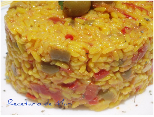 Medir el agua (el doble de agua que de arroz) y desleír la pastilla de caldo. Ponerla en el sofrito, añadirle las aceitunas, un poquito de pimienta y sal si fuera necesario. Llevar a ebullición. Le ponemos una pizca de colorante e incorporamos el arroz. Bajamos el fuego al mínimo y esperamos a que se consuma el agua (no dejar que se consuma del todo, apagarlo antes). ¡¡¡¡Dejamos reposar y a comer!!!!