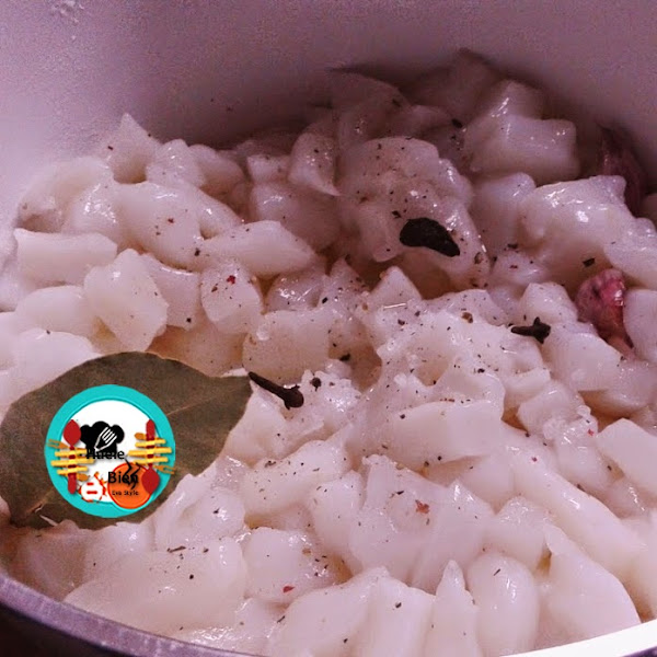 1.- Cortamos el cuadros pequeños los aros de calamar. Salpimentamos. En una olla ponemos un poco de aceite de oliva, rehogamos los ajos enteros. Añadimos el calamar, la hoja de laurel, los clavos y la cayena. Los cocinamos 10 minutos a fuego medio. Pasado ese tiempo añadimos el vino, dejamos reducir.