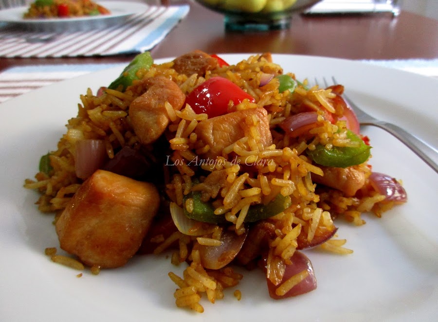 Parece mentira que con lo que me gusta el arroz frito aderezado con salsa de soja no haya publicado antes este plato en el blog. Por lo menos un par de veces al mes preparo algún arroz salteado con distintos ingredientes, no me complico la vida y uso lo que tengo a mano en cada momento, me apetece por igual un arroz frito con vegetales que uno mixto con carne y verduras. En esta oportunidad he aprovechado media pechuga de pollo y los únicos vegetales que habían en mi nevera, el resultado me ha encantado, los pimientos y cebolla dan un suave toque dulce que combina muy bien con el gusto salado de la salsa de soja.