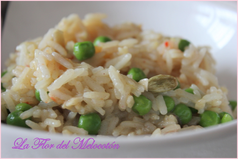 Añadimos los guisantes y el arroz y sofreímos un poco, mientras se calienta el agua (unas 9 tazas).