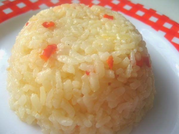 Poner el aceite en el recipiente que se preparará el arroz, cuando este caliente, poner a fuego medio y agregar el pimiento finamente picado, al momento agregar la cebolla, revolver, bajar el fuego y cuando casi esten hechos la cebolla y el pimiento, agregar el ajo finamente picado, esperar un minuto aprox y cuando este el ajo, echar el arroz lavado en un colador con anterioridad, revolver muy bien, esperar un minuto a que los sabores se mezclen y