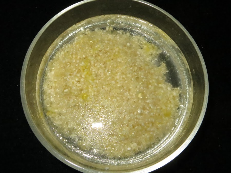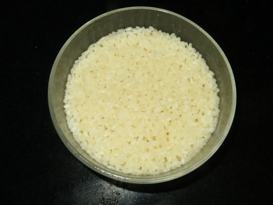 Retiramos el ajo y echamos el arroz sobre el aceite, lo volvemos a meter al microondas durante un minuto a máxima potencia, lo sacamos le damos varias vueltas y le echamos el agua, recordar que siempre hay que echar el doble de agua que de arroz.