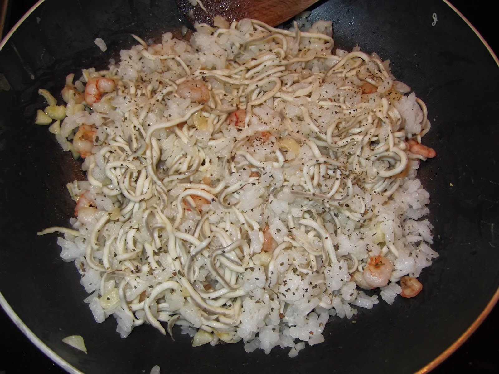Una vez que tenemos en la sartén los dos ingredientes los salamos y cuando estén casi cocinados echamos nuestro arroz blanco, le damos un par de vueltas para que coja toda el sabor del pescado y le echamos un poco de albahaca por encima para terminar