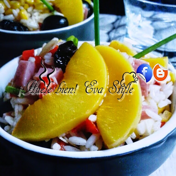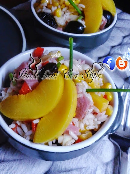 Un arroz blanco cocido con melocotón en almíbar y pasas entre otros ingredientes.