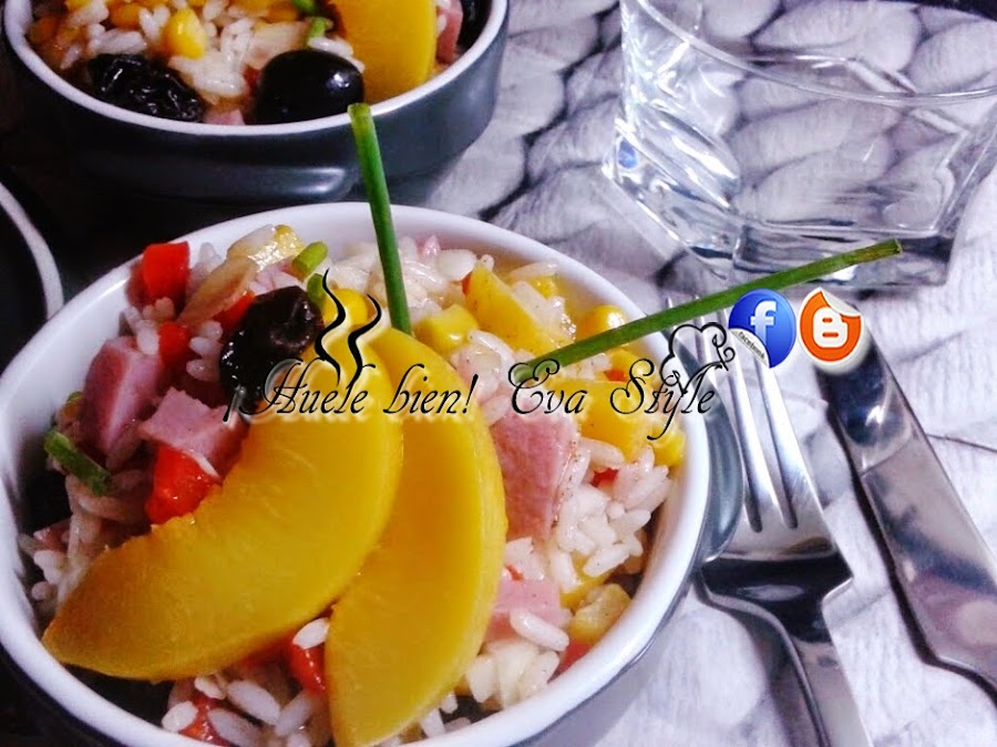3.- En una sartén añadimos unas cucharas de margarina, saltemos las pasas unos minutos y añadimos el arroz cocido. Removemos 2 o 3 minutos más, retiramos del fuego. Mezclamos todos los ingredientes con el arroz. Incorporamos las aceitunas negras sin picar y las almendras. Picamos unos tallos de cebollino, decoramos con los gajos de melocotón rociamos con un poco de pimienta molida y canela en polvo. Servimos en seguida.
