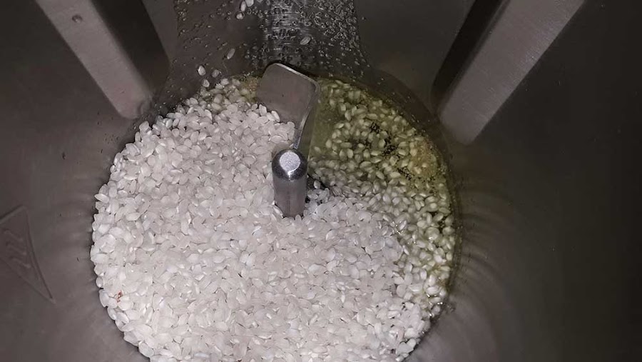Añadimos el arroz por el bocal y programamos: 1 min. a veloc. 1, temp. 100º y potencia 5.