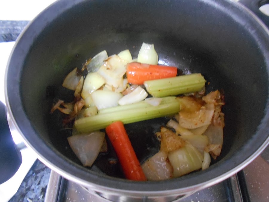 Ahora pasaremos a hacer el caldo. En una olla sofreimos las verduras.