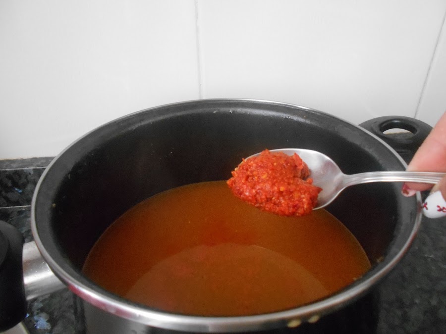 Mezclamos el sofrito o salmorreta con el caldo. Como veis coge bastante color asi que no necesita ni azafran ni colorante...